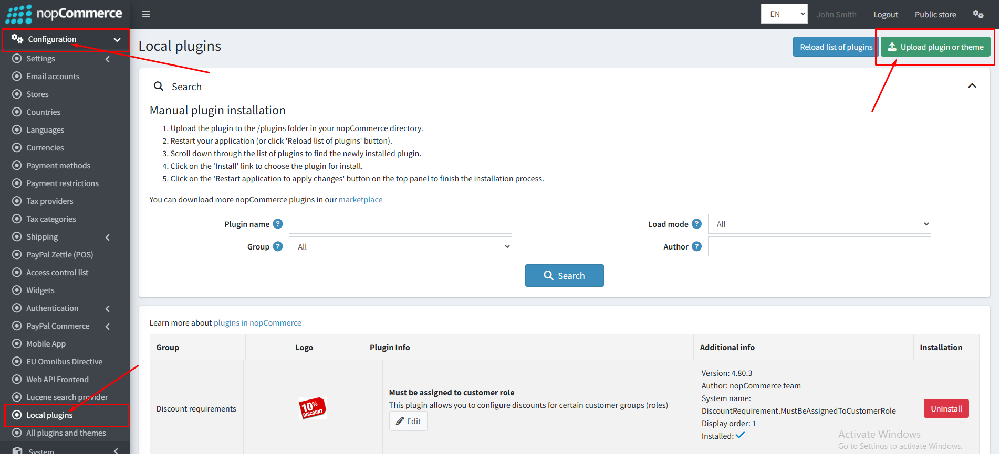 - Navigate to Configuration → Local Plugins in the nopCommerce admin panel.