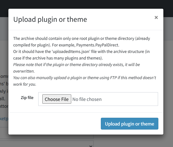 - In the popup window, click Choose File, select the downloaded ZIP file of the theme, and click Upload plugin or theme.