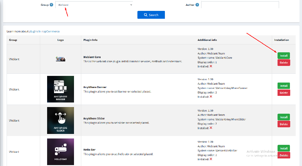- Once the upload is complete, locate the Webiant Core plugin in the plugins list and click Install.